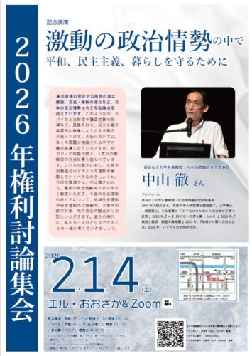 2026年2月14日(土)午前10時より、権利討論集会を開催します。今年も、エルおおさかの会場とZoom併用で開催いたしますので、全国どこからでもご参加いただけます。(一部の分科会は会場のみの開催となります。)